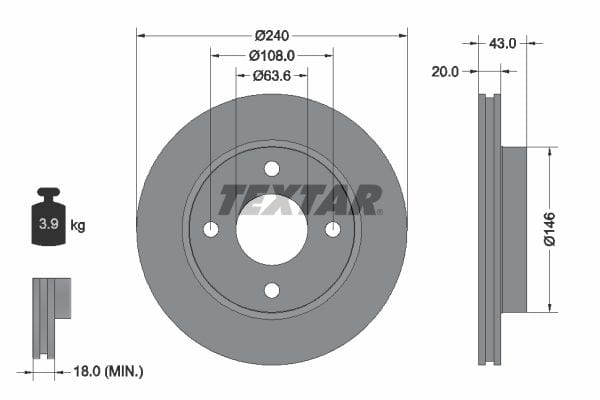 1 X Front Coated Brake Disc Pro Vented 92043103 Textar 247 mm Diameter