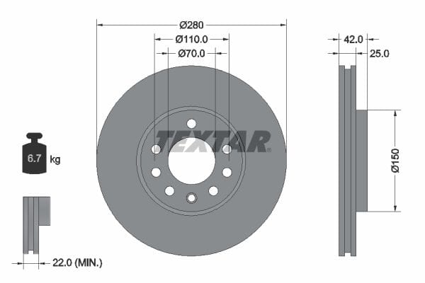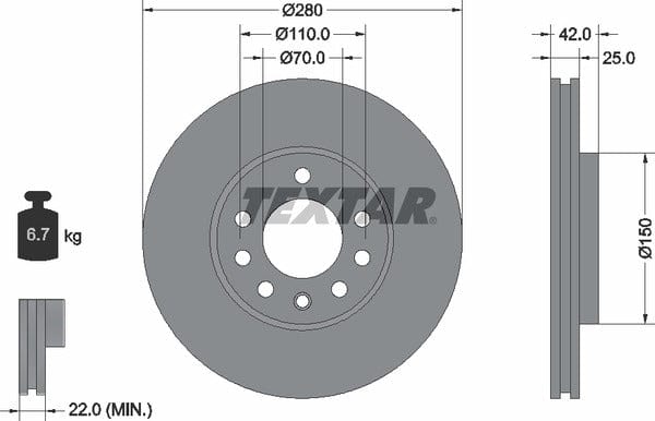 1 X Front Coated Brake Disc Pro Vented 92091903 Textar 280 mm Diameter