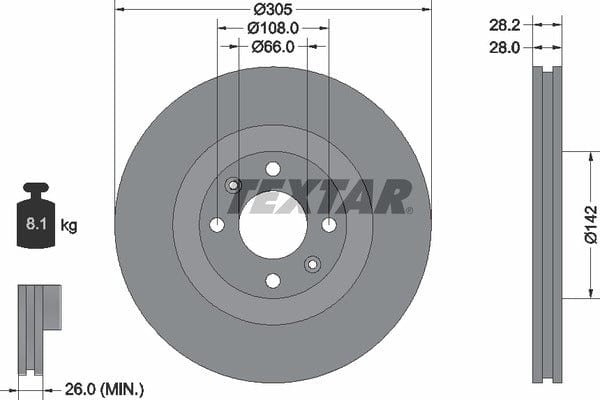 1 X Front Coated Brake Disc Pro Vented 92099003 Textar 300 mm Diameter