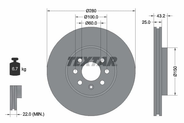 1 X Front Coated Brake Disc Pro Vented 92129303 Textar 280 mm Diameter