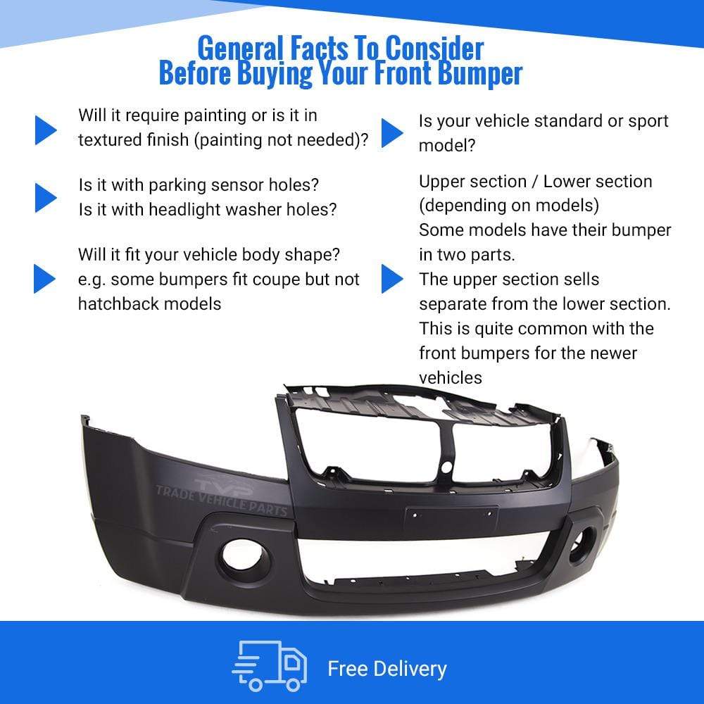 We stock durable front and rear car bumpers, including all associated mounting brackets and hardware. These are insurance-approved replacement units that guarantee a first-time fit for structural integrity. Enter your reg to view only the bumpers compatible with your vehicle's year and trim.