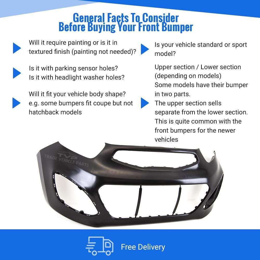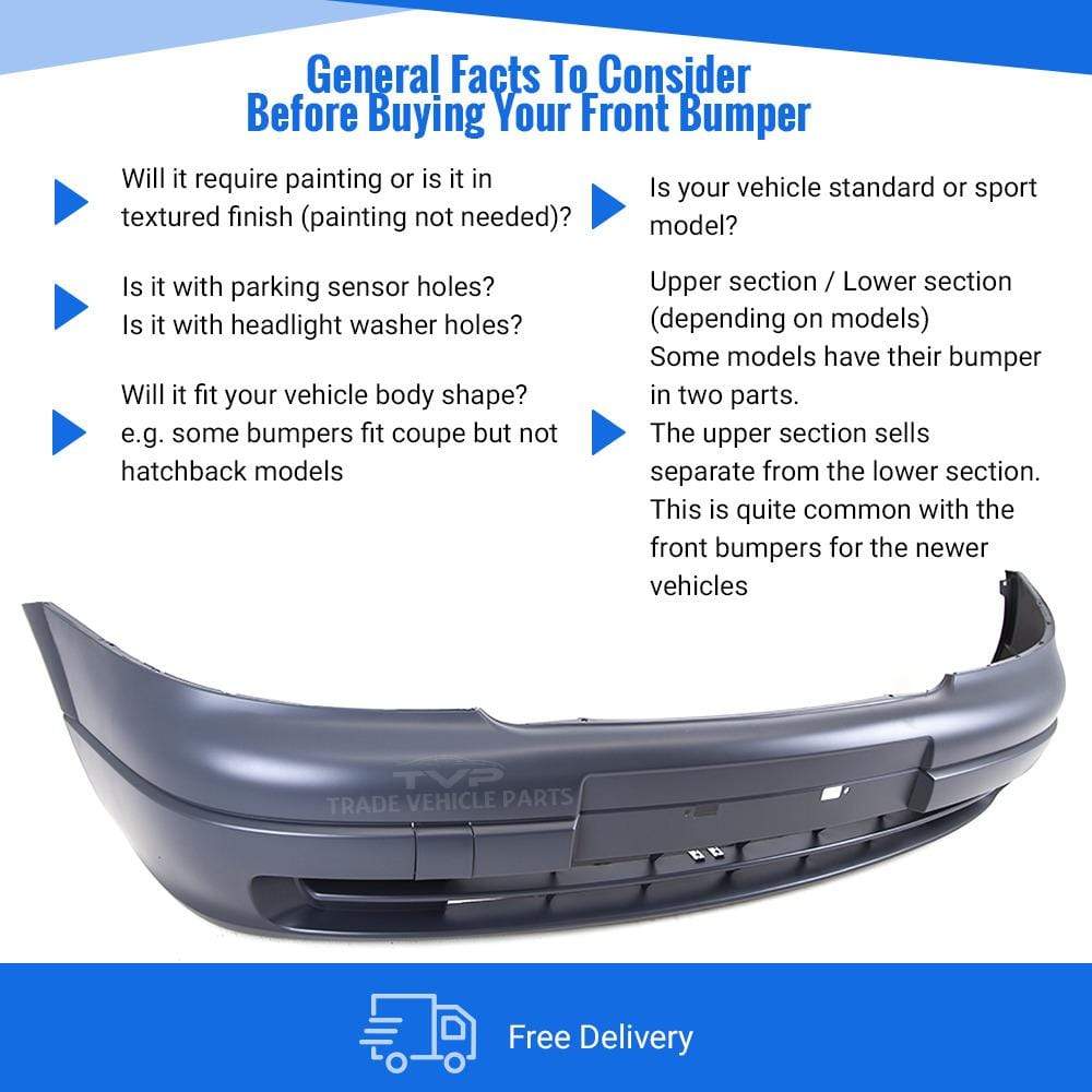 We stock durable front and rear car bumpers, including all associated mounting brackets and hardware. These are insurance-approved replacement units that guarantee a first-time fit for structural integrity. Enter your reg to view only the bumpers compatible with your vehicle's year and trim.