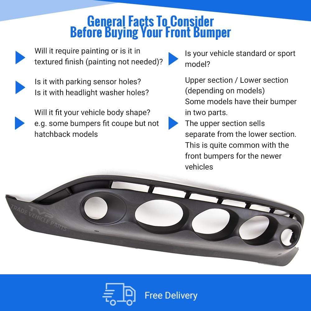 We stock durable front and rear car bumpers, including all associated mounting brackets and hardware. These are insurance-approved replacement units that guarantee a first-time fit for structural integrity. Enter your reg to view only the bumpers compatible with your vehicle's year and trim.