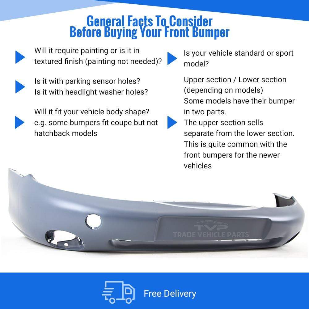 We stock durable front and rear car bumpers, including all associated mounting brackets and hardware. These are insurance-approved replacement units that guarantee a first-time fit for structural integrity. Enter your reg to view only the bumpers compatible with your vehicle's year and trim.