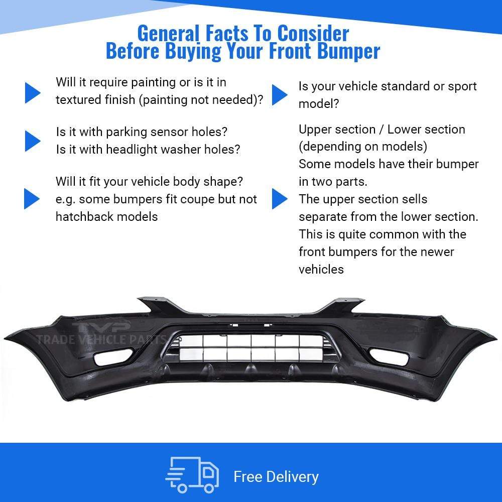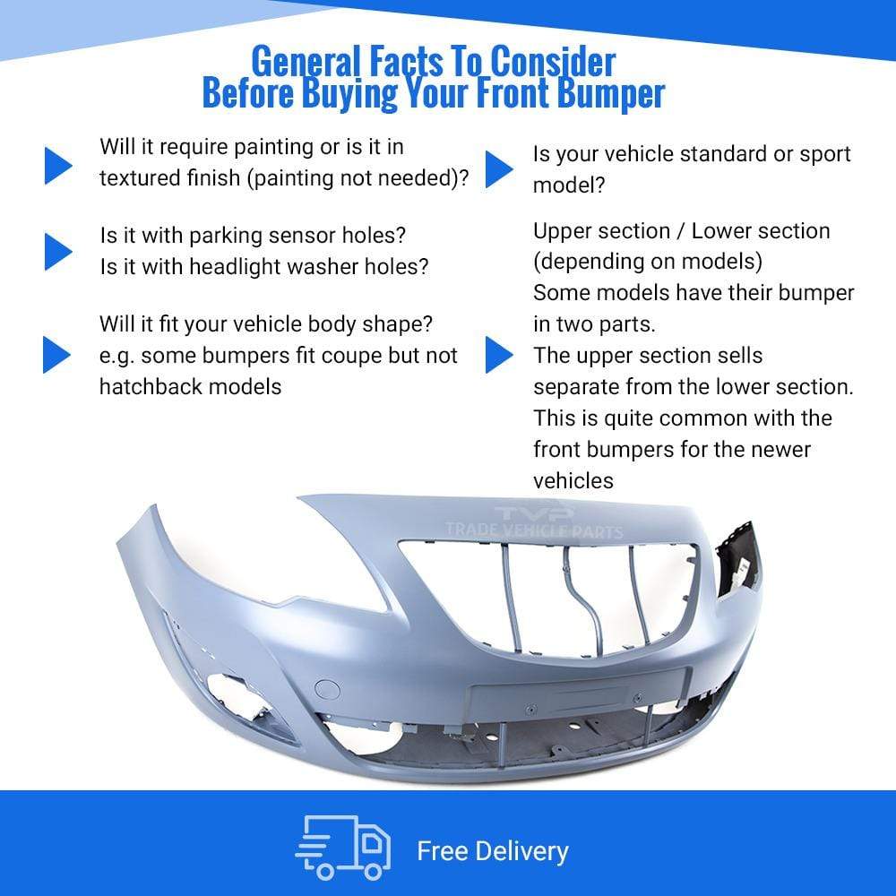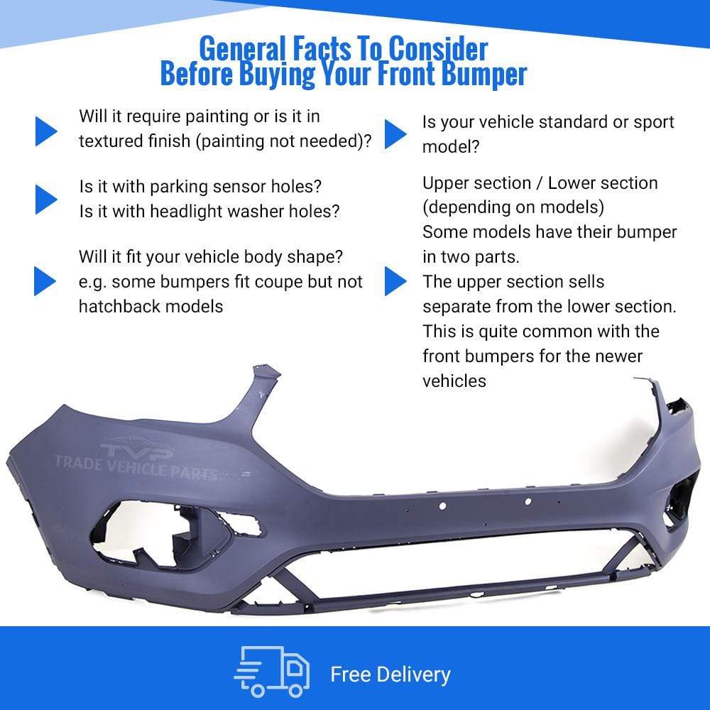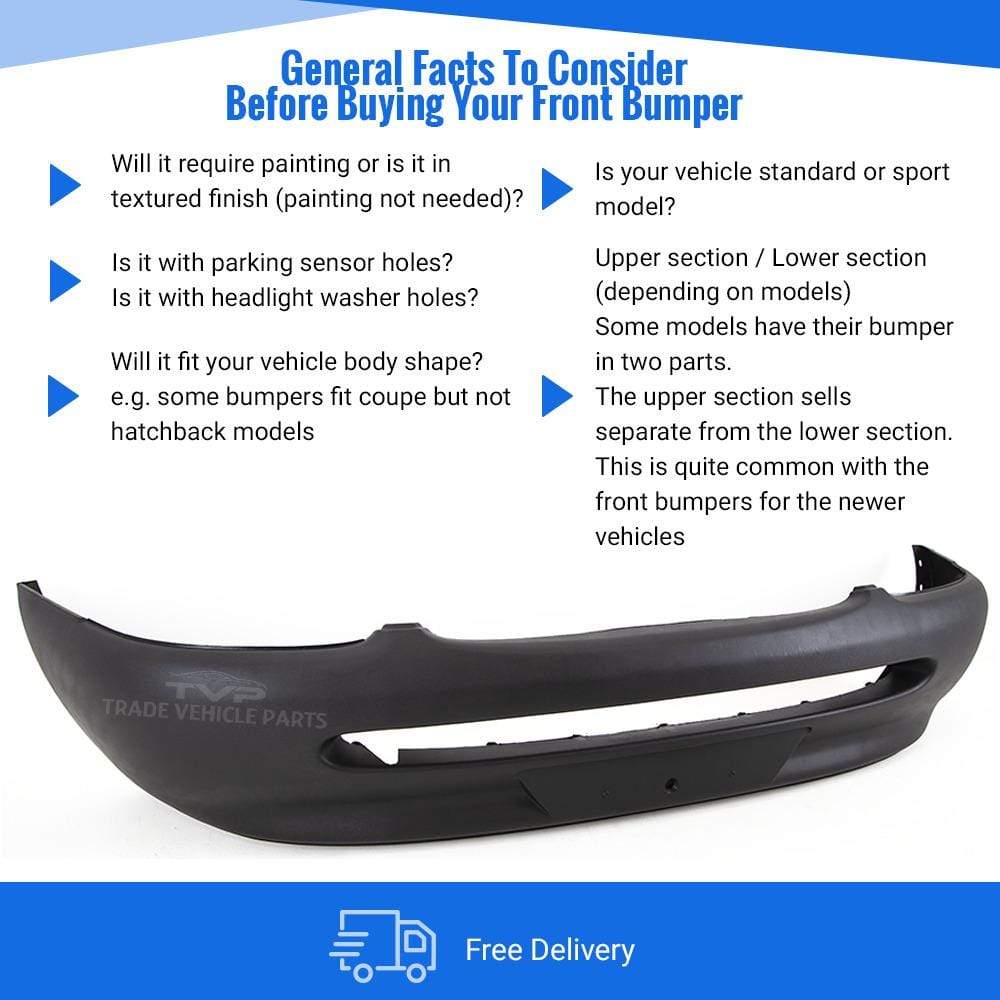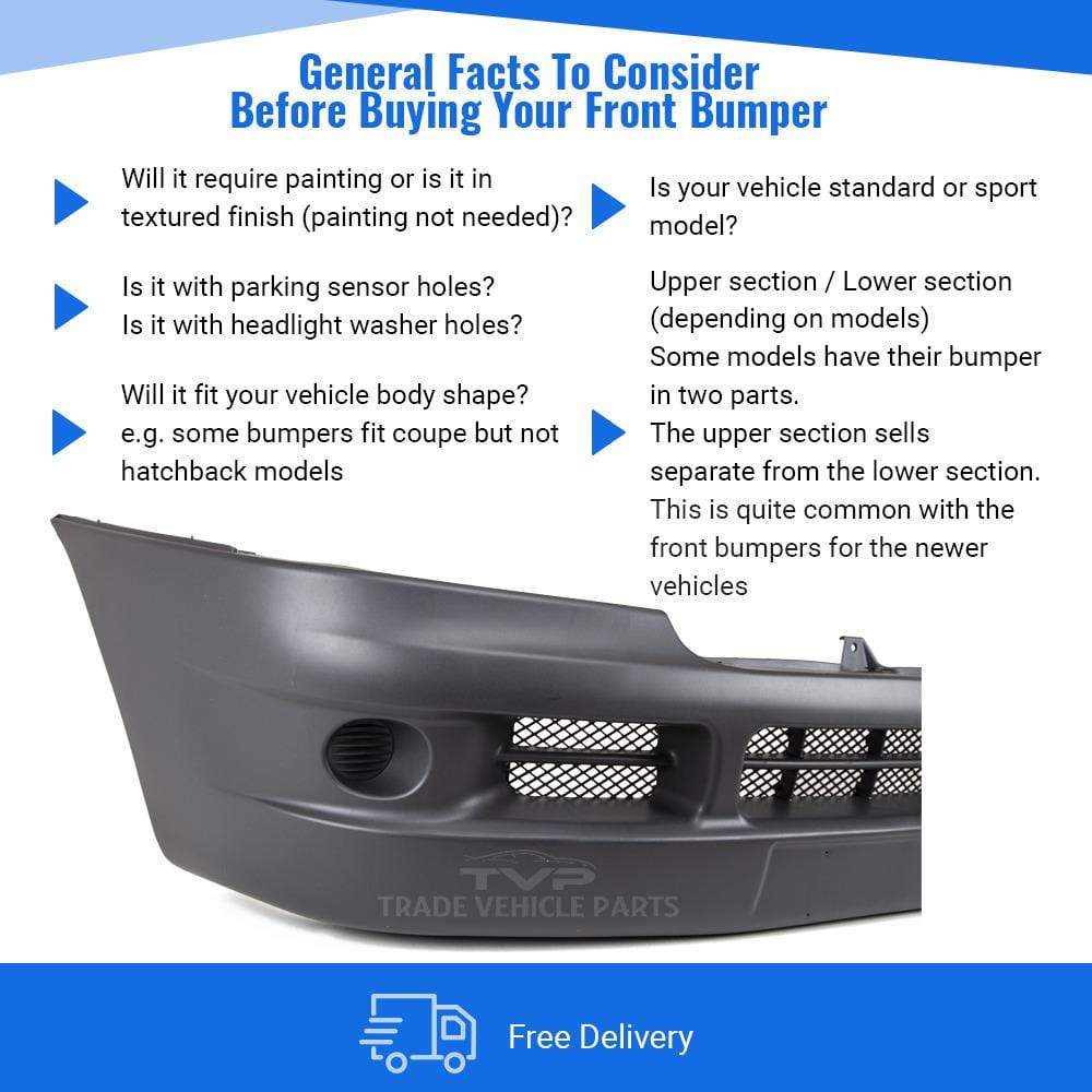 We stock durable front and rear car bumpers, including all associated mounting brackets and hardware. These are insurance-approved replacement units that guarantee a first-time fit for structural integrity. Enter your reg to view only the bumpers compatible with your vehicle's year and trim.
