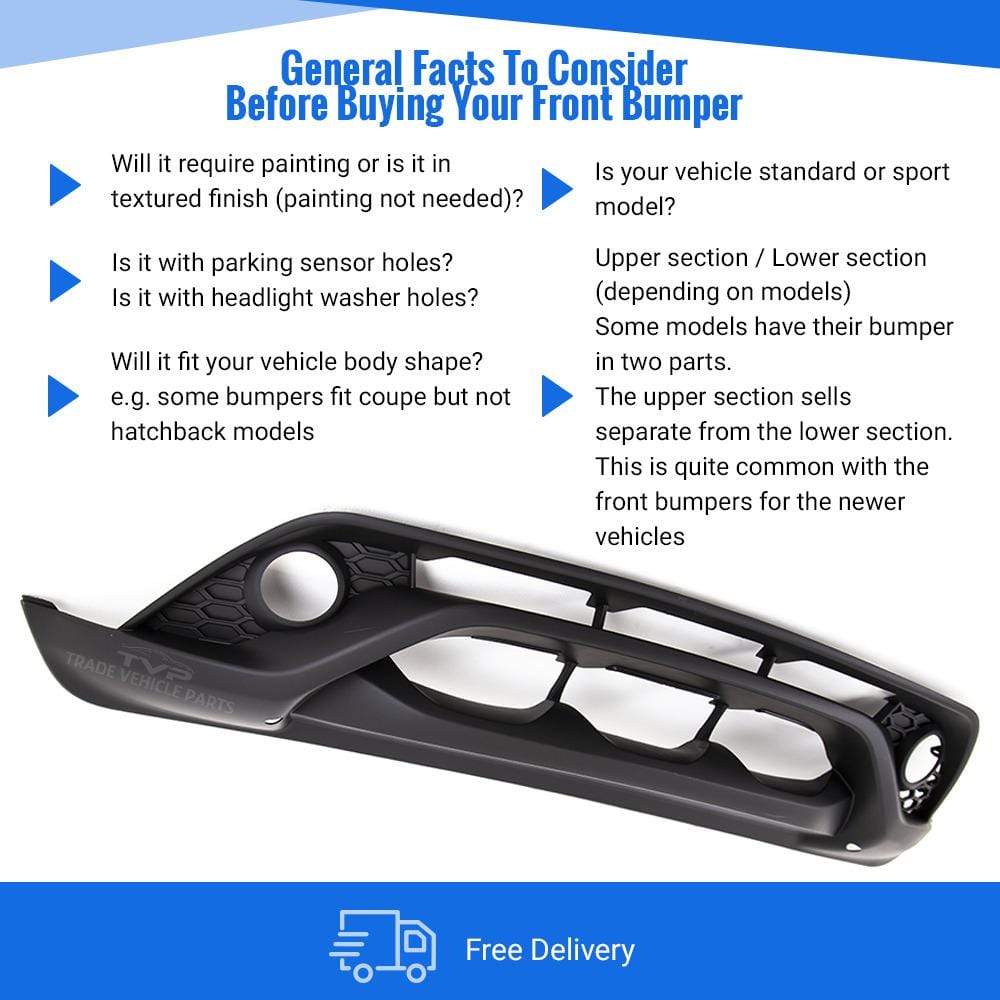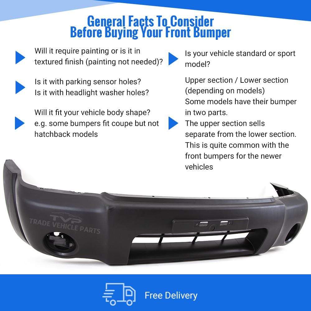 We stock durable front and rear car bumpers, including all associated mounting brackets and hardware. These are insurance-approved replacement units that guarantee a first-time fit for structural integrity. Enter your reg to view only the bumpers compatible with your vehicle's year and trim.