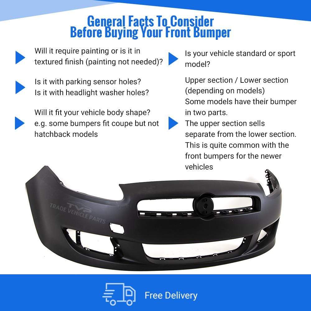 We stock durable front and rear car bumpers, including all associated mounting brackets and hardware. These are insurance-approved replacement units that guarantee a first-time fit for structural integrity. Enter your reg to view only the bumpers compatible with your vehicle's year and trim.