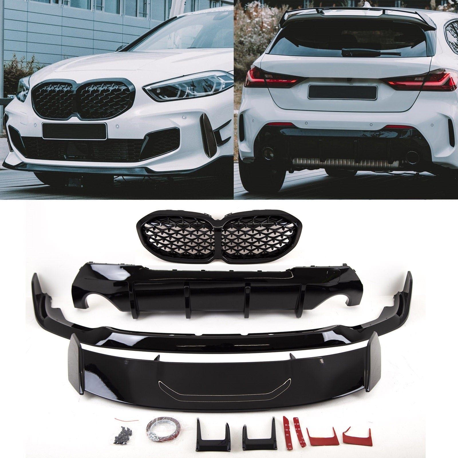 BMW 1 Series F40 2019- Aero Bodykit Front Splitter Rear Diffuser Kidney Grilles Roof Spoiler Aero Canards M Performance Style Gloss Black
