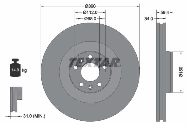 1 X Front Coated Brake Disc Pro Vented 92122203 Textar 360 mm Diameter