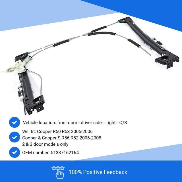 Fits Mini One Cooper R50 R53 2006-10/2006 Window Regulator Without Motor Front Driver Side 3 Bolt Type